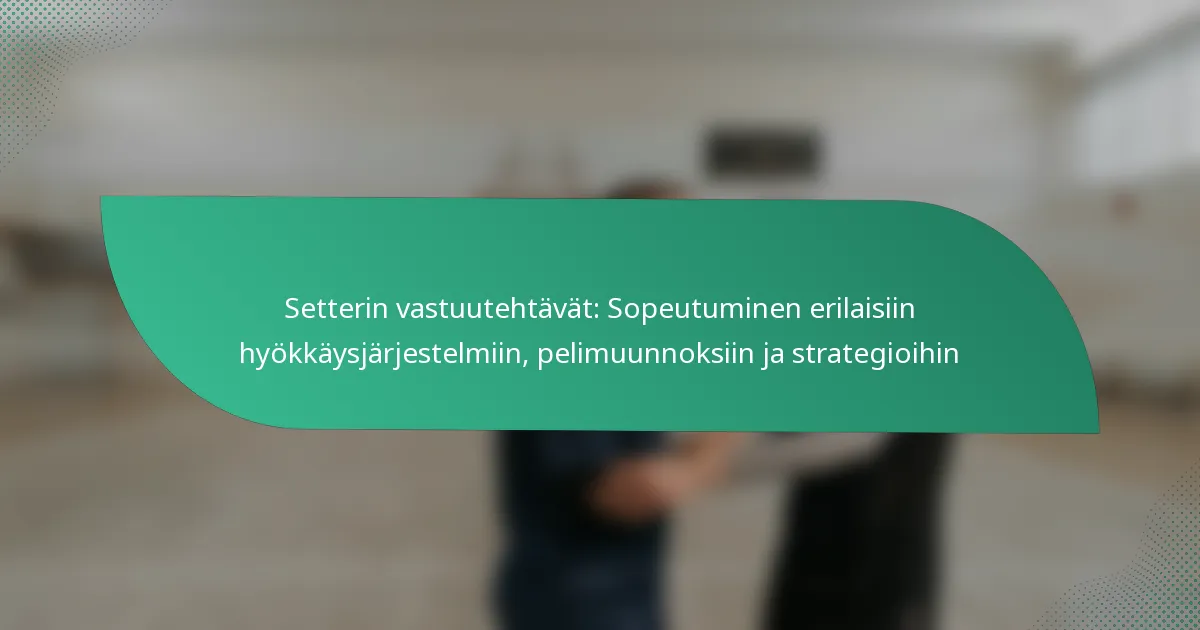 Setterit sopeutuvat erilaisiin hyökkäysjärjestelmiin ymmärtämällä kunkin järjestelmän ainutlaatuiset ominaisuudet ja vaatimukset. Tämä joustavuus mahdollistaa joukkueen suorituskyvyn optimoinnin ja viestinnän parantamisen pelaajien kesken, varmistaen, että strategiat ovat linjassa valitun hyökkäyslähestymistavan kanssa.